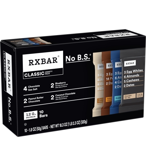 Can’t decide? No problem. Reach for this variety pack and enjoy the simple, delicious ingredients that make RXBAR protein bars the perfect way to fuel your day. This 10-bar variety pack includes Chocolate Sea Salt, Blueberry, Peanut Butter Chocolate, and Coconut Chocolate flavors. Each bar delivers 12g of protein, crushes sweet cravings and fits perfectly into your routine. Whether at the gym, in the office, or with your morning coffee, elevate your day with RXBAR protein bars.